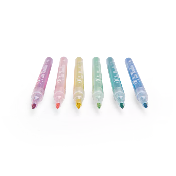 Faites scintiller vos dessins, coloriages et toutes vos créations avec les 6 feutres paillettes Les Rosalies. Rangez-les, pointes vers le bas pour une utilisation optimale.