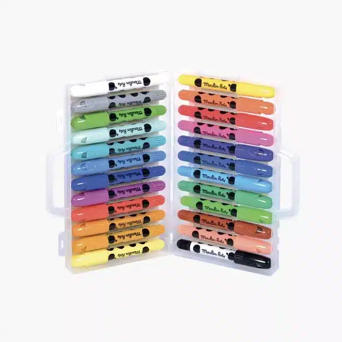 À emmener partout ! Valisette de 24 crayons-stylos de cire 1er âge, aux belles couleurs qui glissent sur le papier. Leur corps en plastique évite de se tacher les mains, avec un bouchon et une molette pour faire sortir la mine. Les traces sur textile se lavent facilement.
