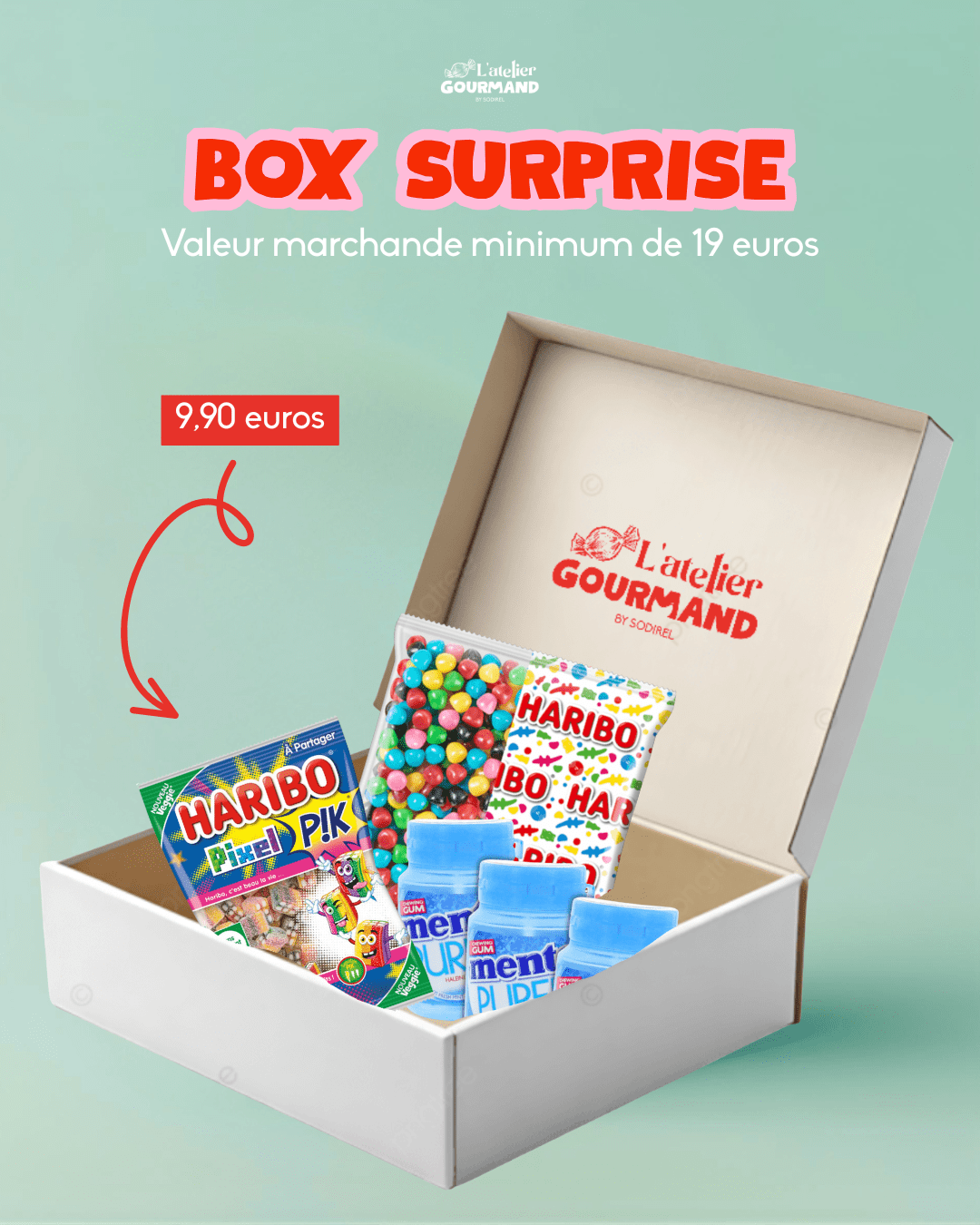 Chaque box renferme une sélection aléatoire de confiseries : bonbons, gourmandises acidulées, douceurs fruitées… une composition qui change selon les arrivages, pour un effet surprise garanti ! 🎉