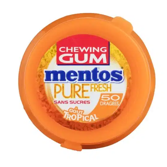 Envie de fraîcheur? Découvrez Mentos Pure Fresh, de délicieuses dragées de chewing-gum sans sucres en bottle au cœur fourré déclinées sur toute une gamme de parfums. Laissez-vous séduire par Mentos Pure Fresh tropical : le mélange subtil des saveurs de l’ananas, de la mangue et de l’orange .