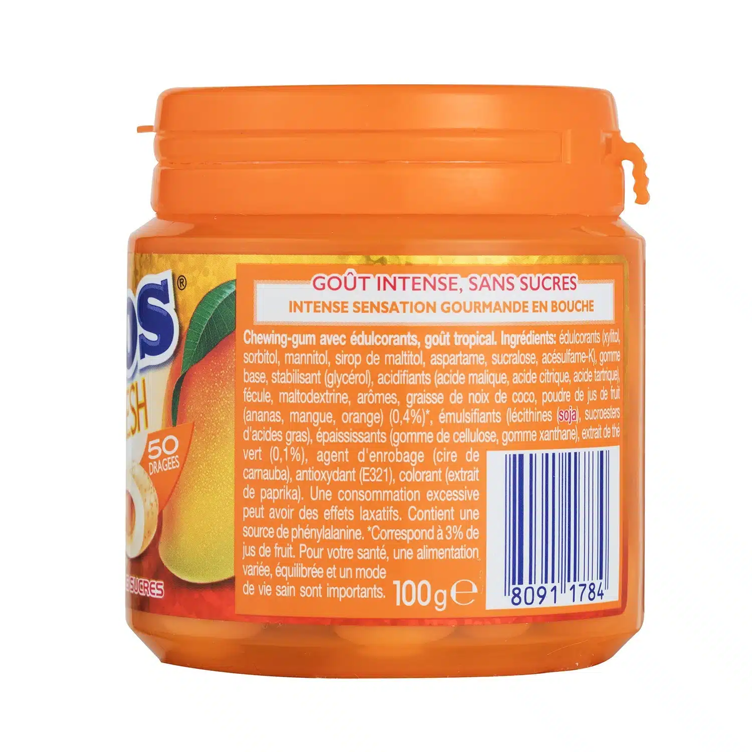 Ingrédients: édulcorants (xylitol, sorbitol, mannitol, sirop de maltitol, aspartame, sucralose, acésulfame-K), gomme base, stabilisant (glycérol), acidifiants (acide malique, acide citrique, acide tartrique), fécule, maltodextrine, arômes, graisse de noix de coco, poudre de jus de fruit (ananas, mangue, orange) (0,4%)*, émulsifiants (lécithines (SOJA), sucroesters d’acides gras), épaississant (gomme de cellulose, gomme xanthane), extrait de thé vert (0,1%), agent d’enrobage (cire de carnauba), antioxydant (E321), colorant (extrait de paprika).