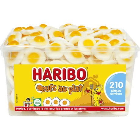 (F) CONFISERIE GÉLIFIÉE / Ingrédients: sirop de glucose; sucre; dextrose; gélatine; acidifiant: acide citrique; arôme; colorants: carotènes végétaux, anthocyanes; agents d’enrobage: cire d’abeille blanche et jaune, cire de carnauba. Tenir à l’abri de la chaleur et de l’humidité.