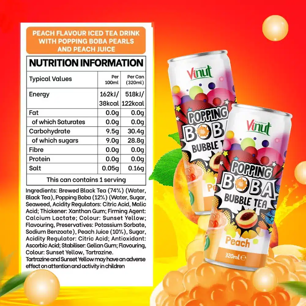 Thé noir infusé (eau, thé noir) 74 %, perles de boba (12 %) [eau, sucre, algues, acidifiants (acide citrique, acide malique), épaississant (gomme xanthane), agent raffermissant (lactate de calcium), colorants (Sunset Yellow, Tartrazine)], jus de pêche (10 %), sucre, antioxydant (acide ascorbique), stabilisant (gomme gellane), conservateurs (sorbate de potassium, benzoate de sodium).