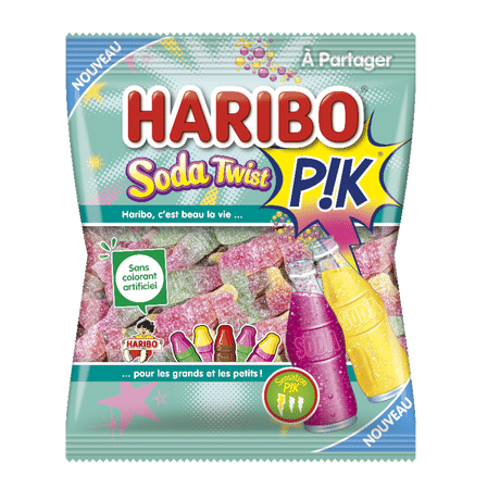 Ingrédients: sucre; sirop de glucose; gélatine; acidifiants: acide citrique, acide malique; agent d’enrobage: cire de carnauba; correcteurs d’acidité: citrate tricalcique, malate acide de sodium; concentrés de fruits et de plantes: carthame, spiruline, pomme, patate douce, carotte, citron; arôme; sirop de caramel. Tenir à l’abri de la chaleur et de l’humidité. Peut contenir des traces de blé, lait.
